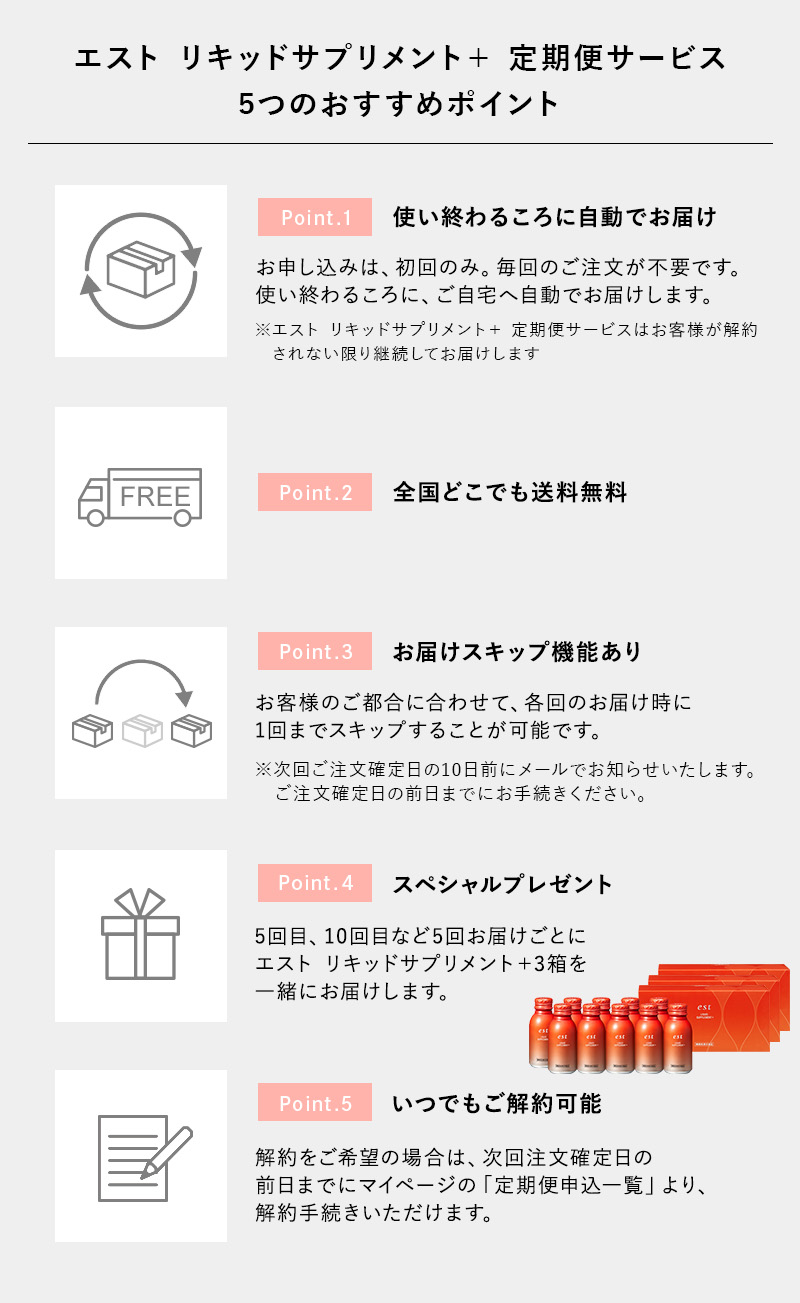 お届け5回ごとに、エスト リキッドサプリメント+3箱(100ml×10本を3箱、計30本)プレゼント!
