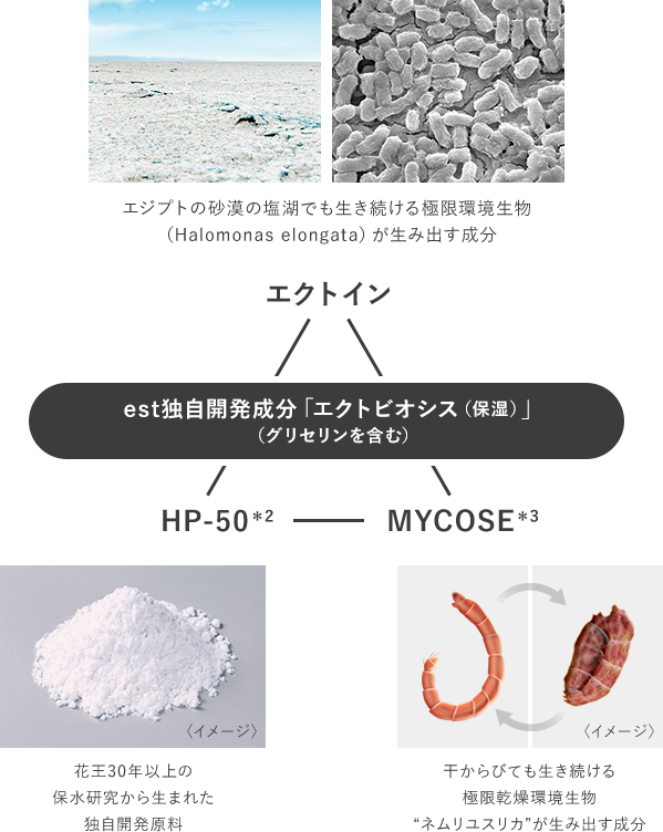 エジプトの砂漠の塩湖でも生き続ける極限環境生物*1 が生み出す成分「エクトイン」と、新たな成分との融合により生まれたest独自開発成分「エクトビオシス(保湿)」