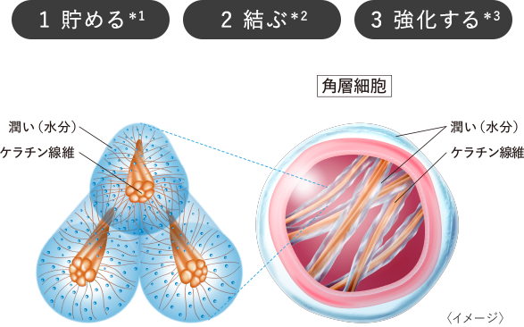 水を操る3つのSTEPで、乾燥が進むと収縮する角層細胞を潤いで満たし、