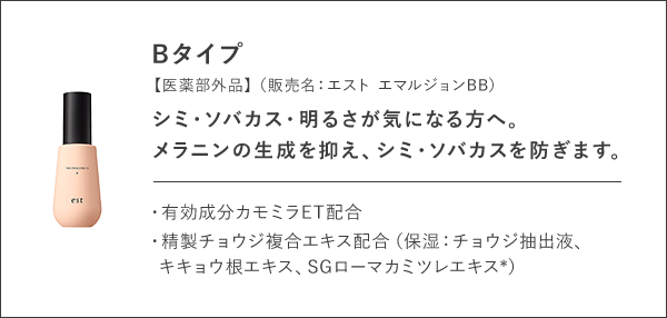 *2 Bタイプのみ医薬部外品メラニンの生成を抑え、シミ・ソバカスを防ぐ(販売名:エスト エマルジョンBB)